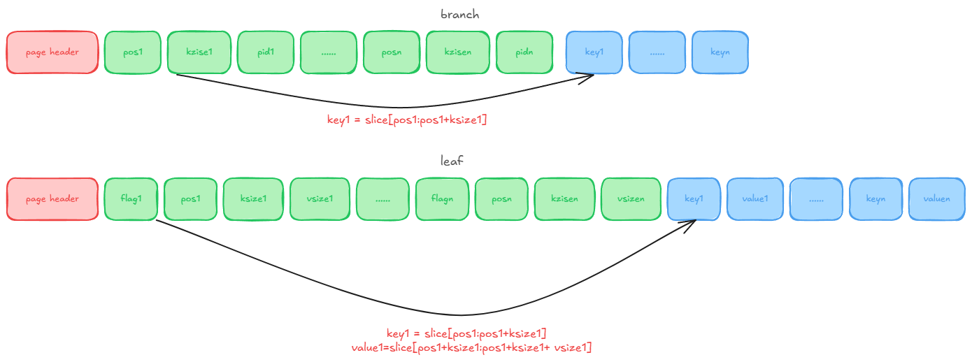 这两个分别存储 B+ tree 的分支页和叶子页。对应结构为:
