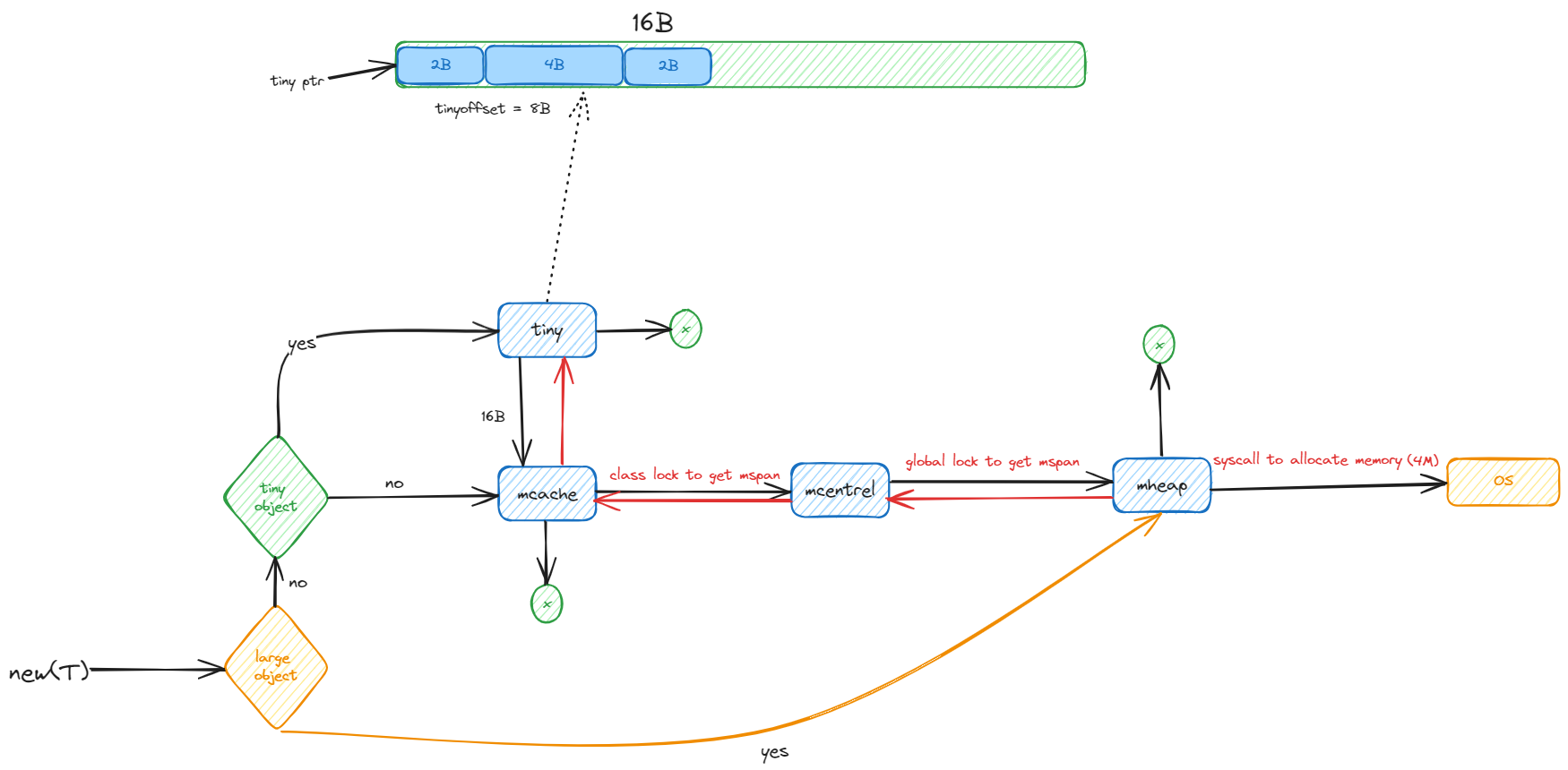 mache 是每个 P (processor)的结构体中都有的,是用来缓存的,因为每个 P 同一时间只有一个 goroutine 在执行,所以 mcache 是不需要加锁的。这也是 mcache 的设计初衷,减少锁的竞争,提高性能。