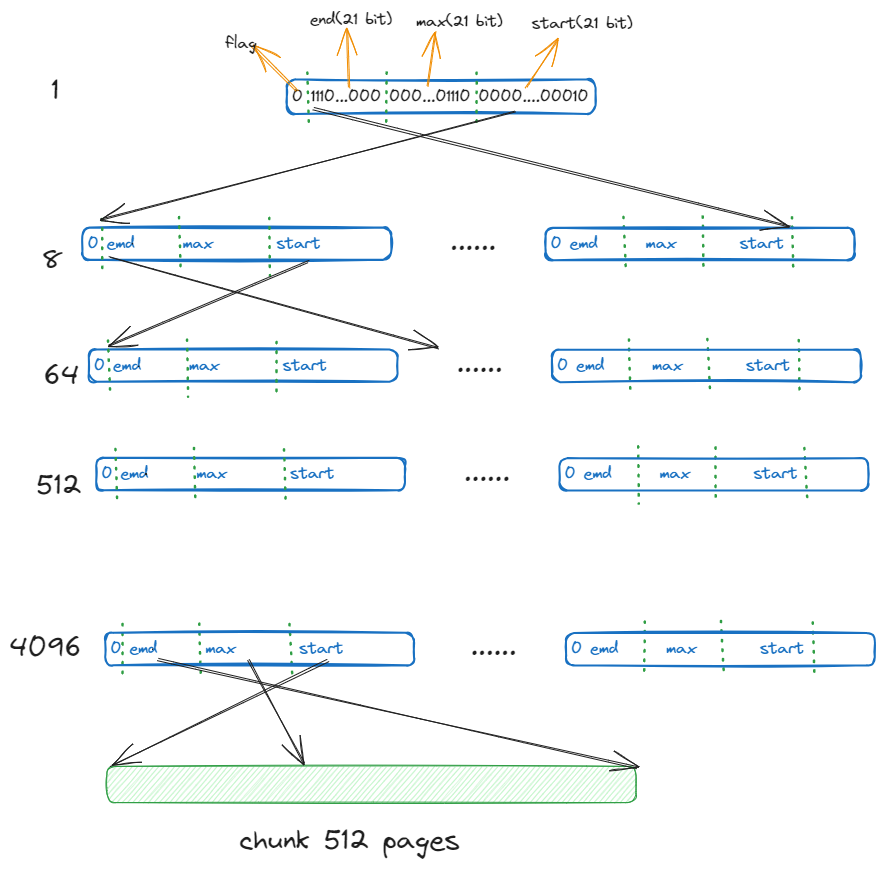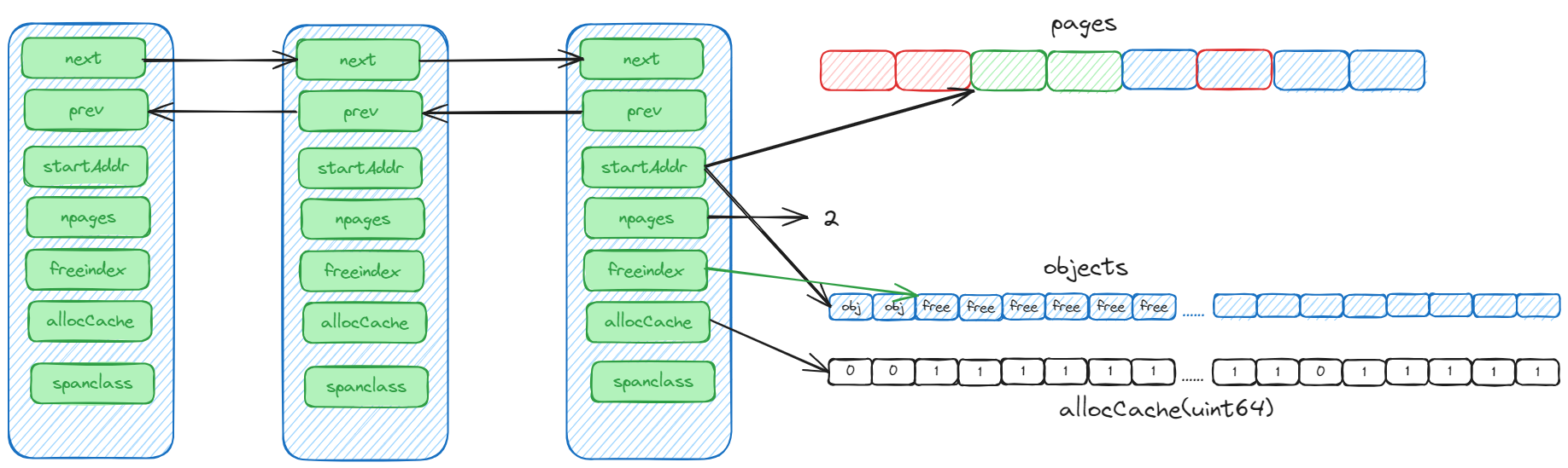- startAddr 是 mspan 的起始地址,npages 是 page 数量。根据 startAddr + npages * 8KB 就可以得到 mspan 的结束地址。