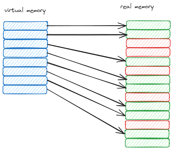 如上图所示,如果直接使用真实的内存,想要连续的内存肯定是申请不到的,这就是内存碎片的问题。而使用虚拟内存,通过 Page 映射的方式,保证内存连续。